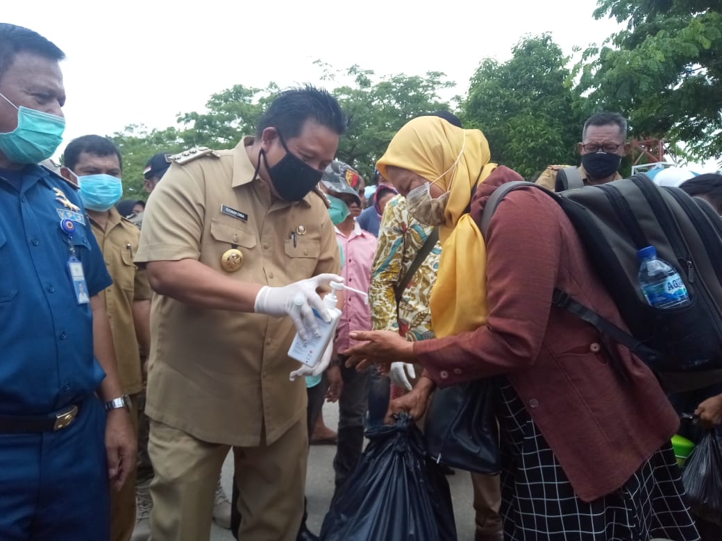 Rusman Emba Turun Tangan Langsung Semprotkan Hand Sanitizer Ketangan Para Penumpang Kapal