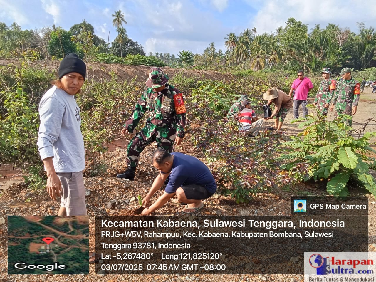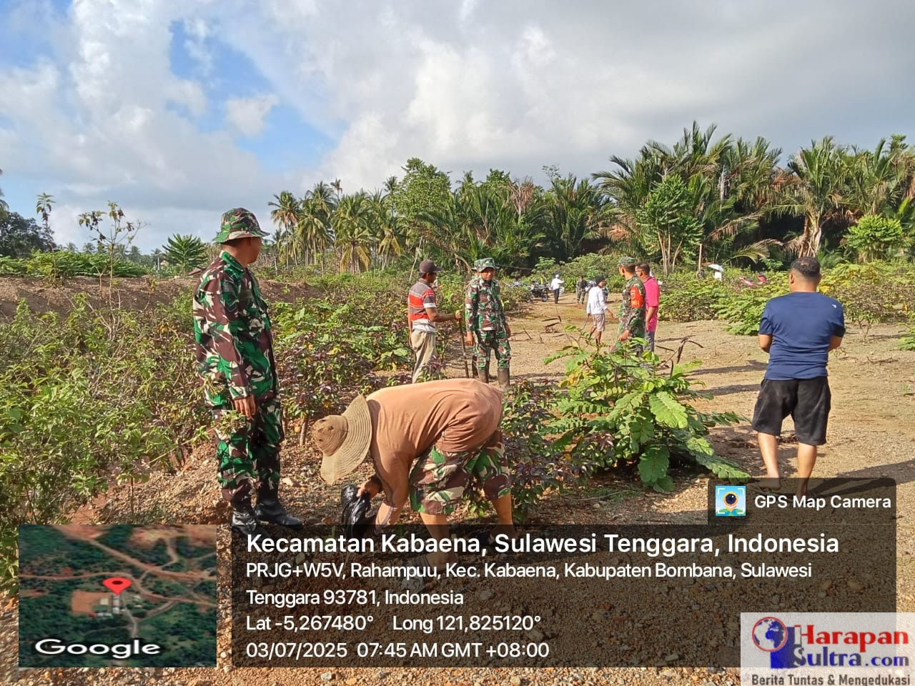 Bombana, Harapansultra.com — Sebagai langkah Upaya mencegah erosi dan banjir serta menciptakan lingkungan yang lebih aman dan nyaman, Babinsa Koramil 1431-02/Kabaena menggelar kegiatan Karya Bakti Penanaman Pohon di Kelurahan Rahampuu, Kecamatan Kabaena, Kabupaten Bombana, Kamis (3/7/2025). Kegiatan ini dipimpin langsung oleh Peltu Muhammad Haris bersama masyarakat setempat.