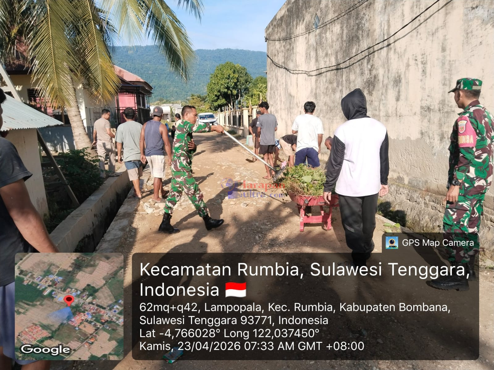 Bombana, Harapansultra.com — Kepedulian terhadap lingkungan kembali ditunjukkan Babinsa Koramil 1431-01/Rumbia bersama warga Kelurahan Lampopala dengan menggelar kerja bakti pembersihan drainase, Kamis (23/4/2026). Kegiatan ini menjadi langkah nyata dalam mengantisipasi potensi banjir sekaligus menjaga kebersihan lingkungan di Kecamatan Rumbia, Kabupaten Bombana.
