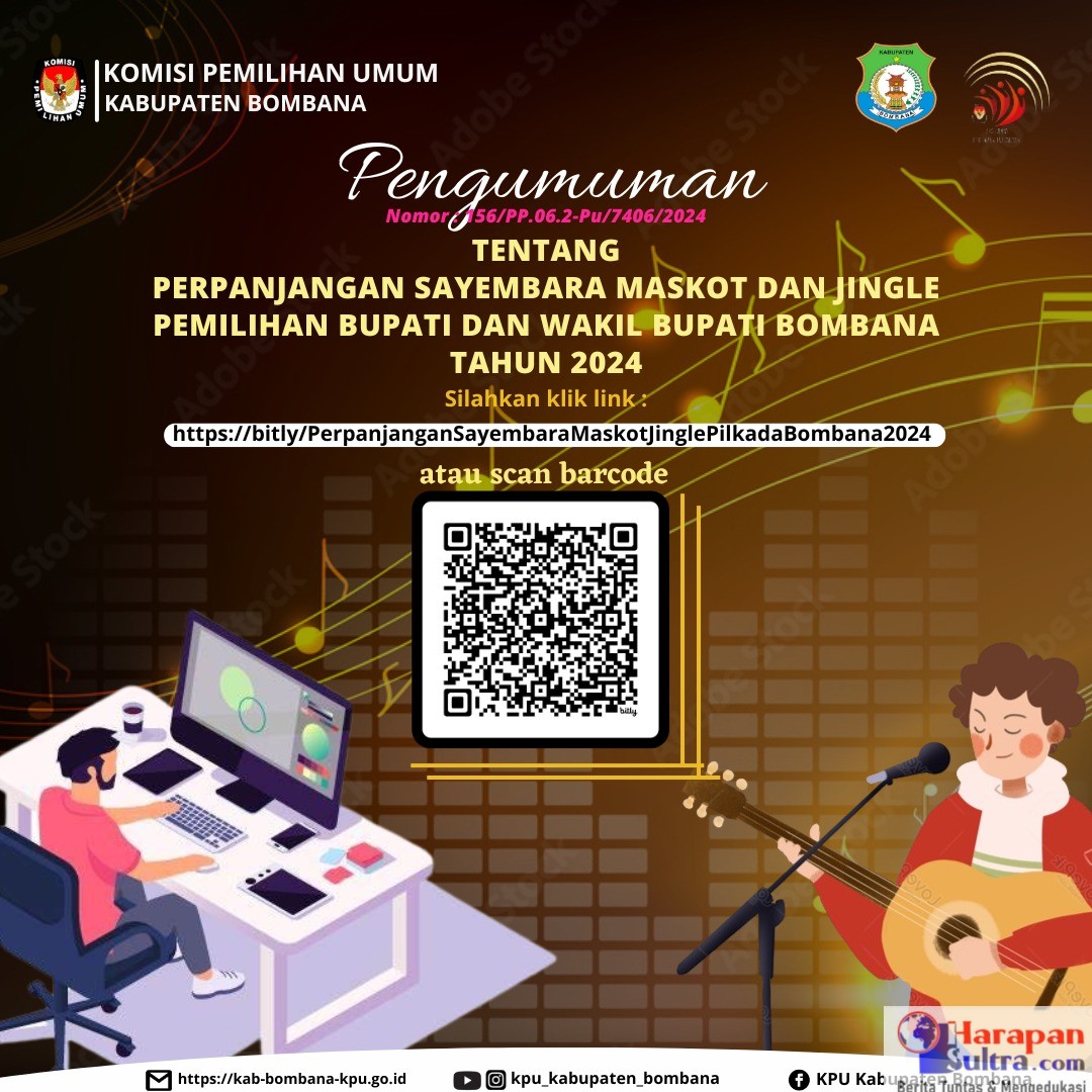 Informasi selengkapnya bisa dilihat pada link resmi KPU Bombana : https://bit.ly/PerpanjanganSayembaraMaskotJinglePilkadaBombana2024