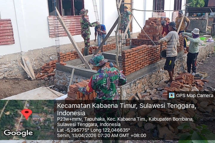 Bombana, Harapansutra.com – Kebersamaan antara TNI dan masyarakat kembali terlihat dalam kegiatan kerja bakti pembangunan WC dan tempat wudhu Masjid Al-Ikhlas di Dusun Damalawa, Desa Tapuhaka, Kecamatan Kabaena Timur, Kabupaten Bombana, Senin (13/4/2026). Kegiatan ini dipimpin langsung oleh Babinsa Koramil 1431-02/Kabaena, Sertu Hardedi, bersama warga setempat.