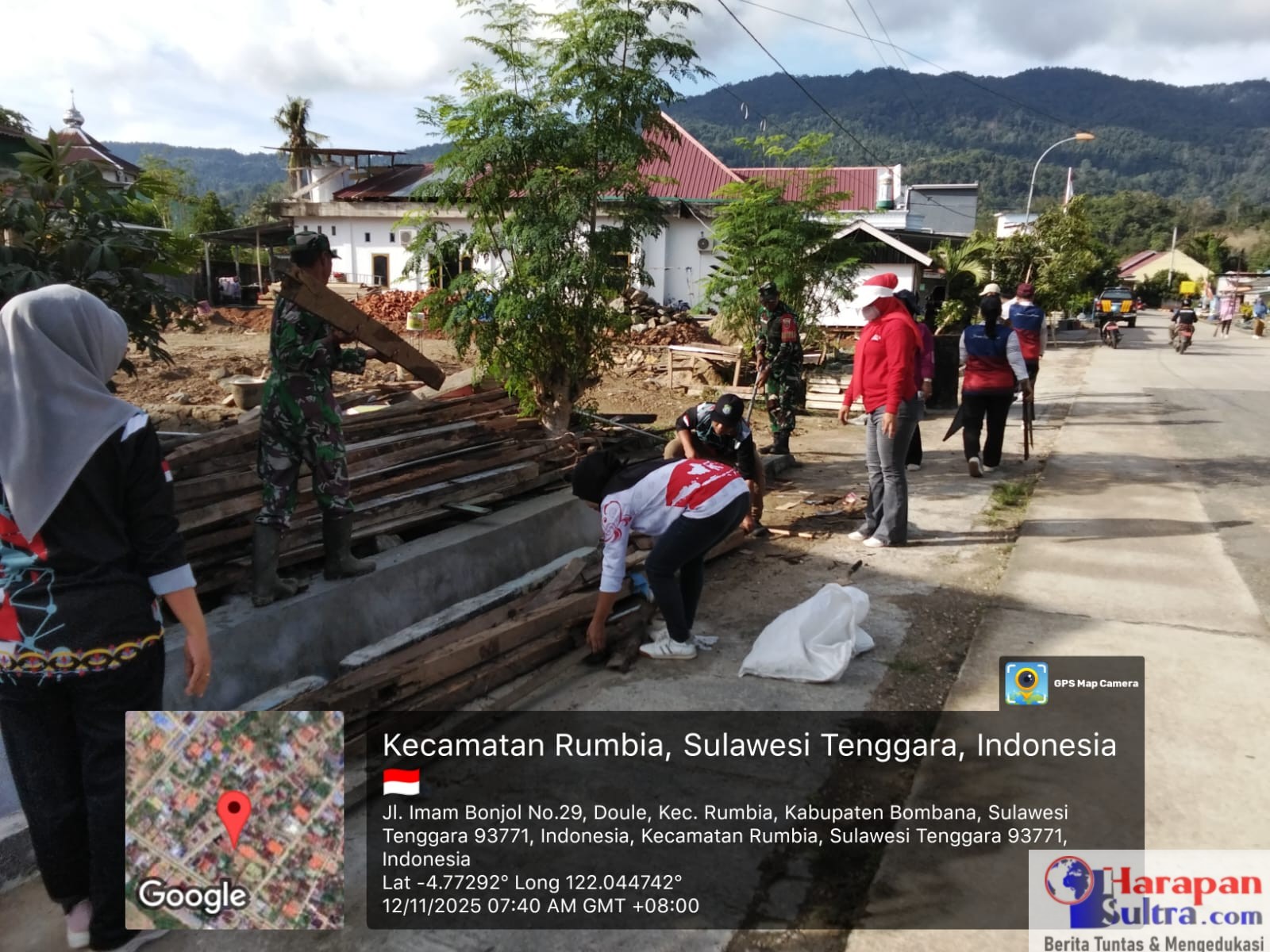 Bombana, Harapansultra.com – Babinsa Koramil 1431-01/Rumbia bersama masyarakat Kelurahan Doule, Kecamatan Rumbia, Kabupaten Bombana, menggelar kegiatan kerja bakti membersihkan parit (drainase). Kegiatan ini dilakukan guna menjaga kebersihan lingkungan sekaligus mencegah terjadinya genangan air dan banjir di musim hujan. Rabu, (12/11/2025)