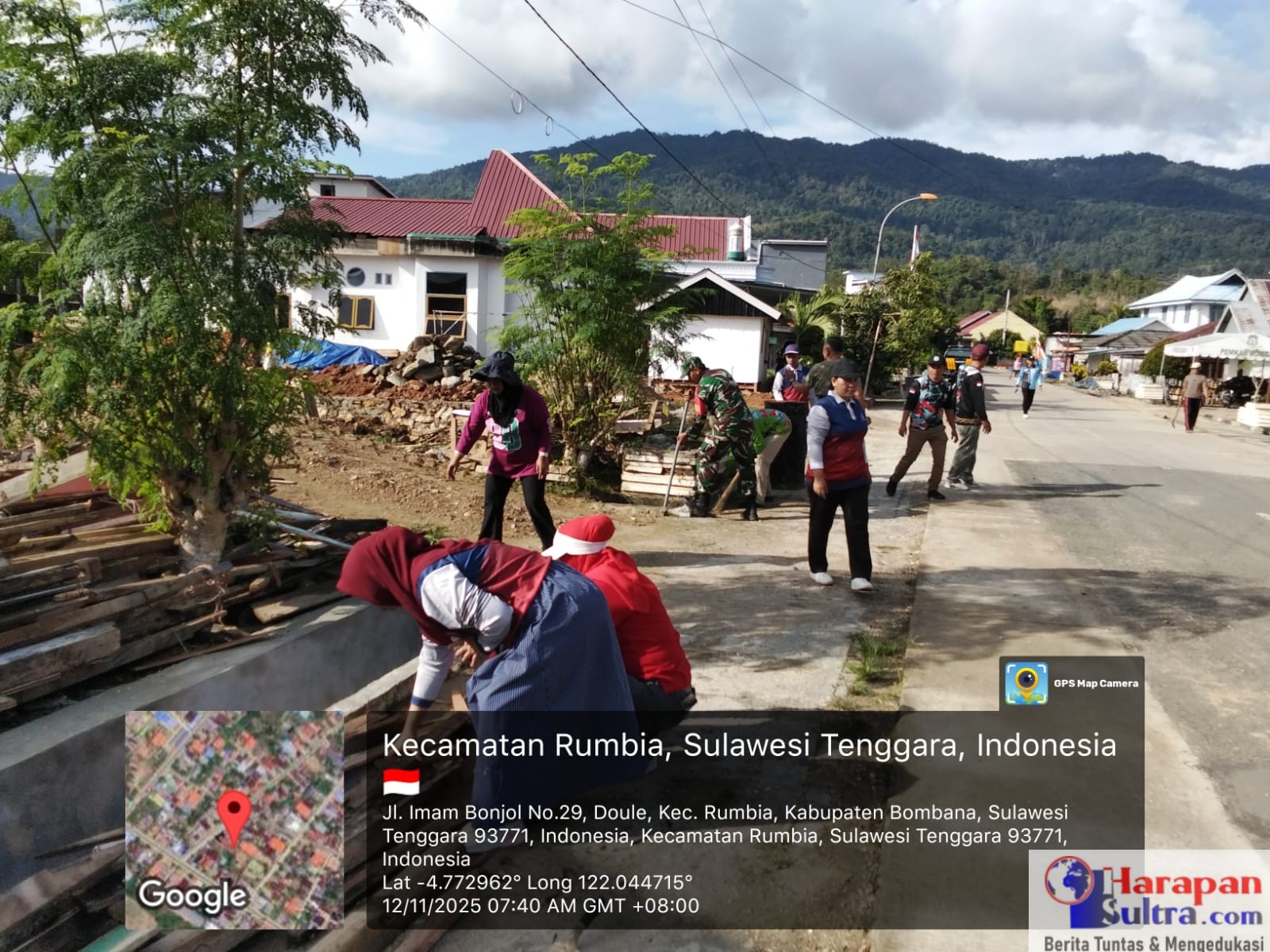 Bombana, Harapansultra.com – Babinsa Koramil 1431-01/Rumbia bersama masyarakat Kelurahan Doule, Kecamatan Rumbia, Kabupaten Bombana, menggelar kegiatan kerja bakti membersihkan parit (drainase). Kegiatan ini dilakukan guna menjaga kebersihan lingkungan sekaligus mencegah terjadinya genangan air dan banjir di musim hujan. Rabu, (12/11/2025)